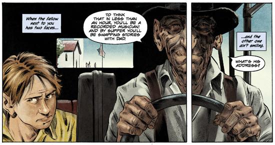 Speaking of, the artwork by Attila Futaki is pretty awesome. It’s got that painted feel that artists like Alex Ross have, and while it starts off being illustrated a little too dark and dank for a story opening it ends up becoming better defined as the narrative progresses. As I said I found the surroundings more haunting than the villain, including a darkened forest with an old subway car and the house within which Jack and Alan have their final showdown that has just the right amount of macabre lighting and hints of visual emphasis to give it a harrowed, visceral appearance. The only real problem with Futaki is that sometimes he illustrates female characters like Sam with distinctly man-ish properties, including a scene where I swear Sam has an Adam’s apple. I get that she was supposed to be disguised as a dude, but I’m pretty sure she shouldn’t resemble that after the reader knows otherwise.