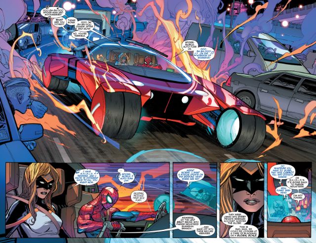 Sadly, such notions are clearly not intriguing enough for Slott to comprehensively develop them. No, Slott would much rather focus on all of Spidey’s new Batman-inspired hardware; go on and tell me the Spidermobile, pictured above, isn’t just a Tumbler repaint. Or, worse still, he’d prefer to develop a latent plot thread which is both utterly asinine and a complete undercutting of Superior Spider-Man‘s emotional ending. I won’t spoil the latter here, but it’s in the first chapter; I dare you not to imprint your palm upon your forehead when you see it.