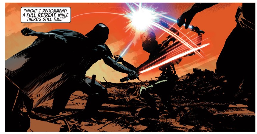 Chiefly, Vader Down is an excuse to get the diametrically-opposed casts of both Darth Vader and the ongoing Star Wars series to meet, shake hands and get to know each other (or, rather, meet, exchange blaster fire and attempt to get out alive). It’s the first crossover the Star Wars ongoings have had since they started in 2015, and thus feels suitably epic in proportion to the scope of its six issues. Gillen and Aaron have crafted a crossover that’s less about universe-altering plot shake-ups and more about smaller character interactions. Both writers have done a fantastic job making their respective casts interesting and nuanced – a particularly impressive feat especially for Gillen’s cast of homicidal maniacs in Darth Vader – and there’s a sense of excitement when they cross paths with each other. Han Solo and Dr. Aphra exchanging blaster shots and verbal witticisms in equal measure is no less enjoyable than R2-D2 facing off with his black-clad counterpart BeeTee, the latter packing more heat than a barbecue pit. In terms of the few ongoing series plots with developments that stick in Vader Down, the most compelling is Vader’s continued attempts to get back in the Emperor’s good books, his battle against the Rebels serving as an opportunity to regain some face (though not the parts of it that were burned off on Mustafar).