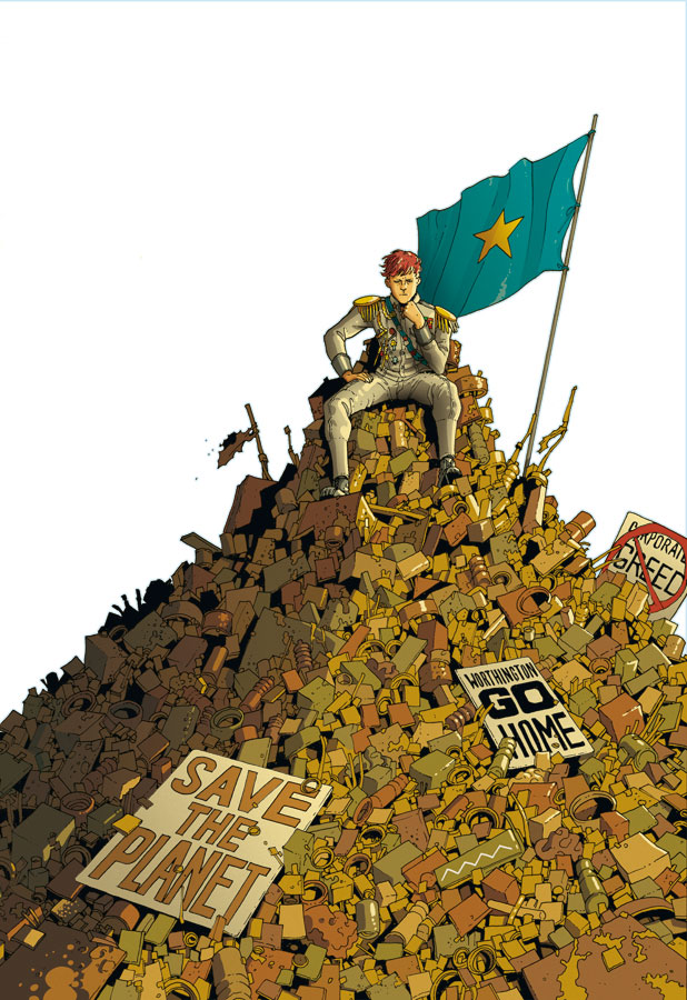 Stuff happens in this book, but it’s so disconnected from entertainment that it ends up being white noise. There’s substantial weight given to some kind of myth arc involving the aforementioned nomads and the squidtopus they apparently worship, but it moves by so quickly and is so very incongruous from the main story of Neo-Greenpace exploits that it almost feels like writer Joe Harris is telling two different stories. One of the blurbs for this story touts it as a science fiction story the same way some would consider An Inconvenient Truth as sci-fi; meaning it’s actual fiction about science, rather than with robots and Blade Runner-style hairdos. If that’s true, I can’t decide whether the fiction lies in turning a giant mass of congealed plastic into a floating island nation or in having Fremen-esque Native American tribesmen living on it. Because, however you slice it, the highly intelligent squidtopus is clearly based on fact.