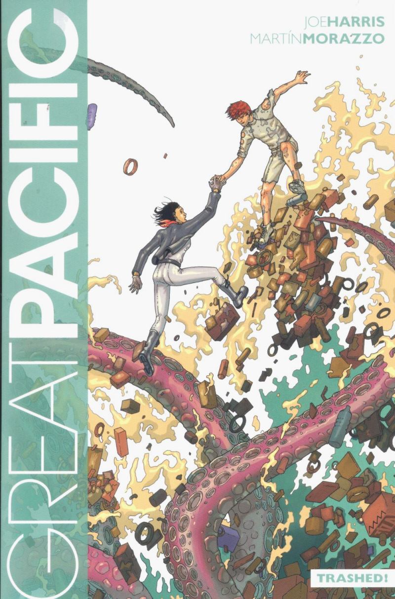 I actually had to struggle to remember a lot of this book months after reading it, which is never a good sign. At least if it’s a terrible book I can remember details vividly, if only for the wrong reasons, and write accordingly. If it’s good I can sing its praises until my larynx resembles a mangled chew toy. Boring, middle-range books just sit too much on the fence to be interesting or memorable, and that’s the part of the curve where Great Pacific‘s story sits. I get the feeling Harris is trying his damnedest to give us an Aesop – possibly that littering’s bad? – but it becomes so overwrought and so buried in the almost farcical elements that it’s nigh-impossible to take seriously. Yes, we know the Great Pacific Garbage Patch is bad. Yes, we know humans are ass hats. Yes, we love squidtopus. Thank you. Now if you could give us some actual story, that’d be gravy.